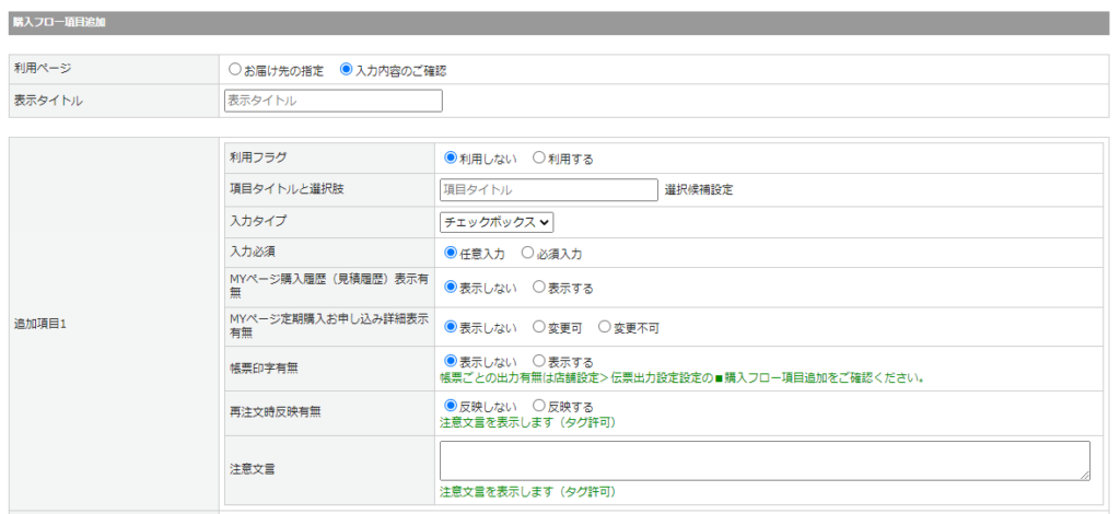 基本設定>カートシステム設定>[カート・決済機能設定]タブ の購入フロー項目追加から、追加項目ごとに設定を行います。