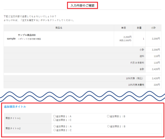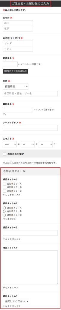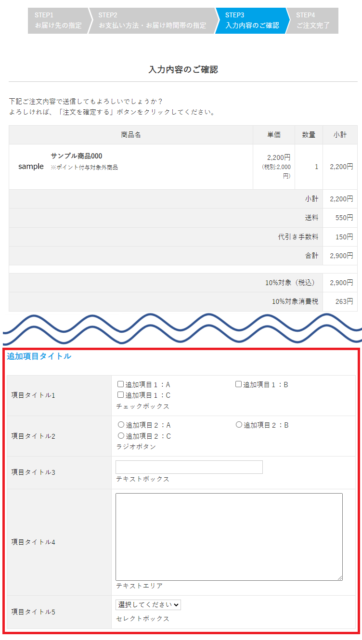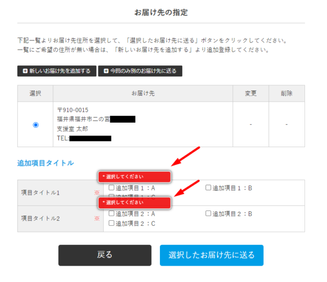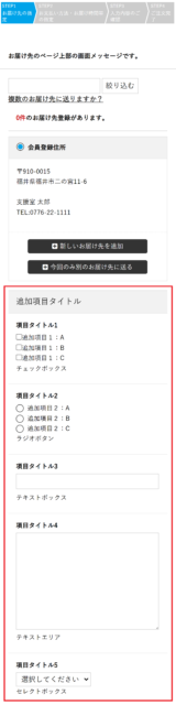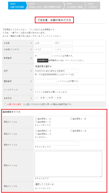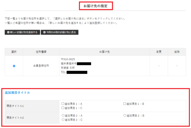 設定内容によって、「お届け先の指定画面」「入力内容のご確認画面」に追加項目の入力枠が表示されます。