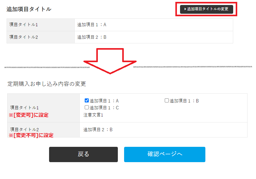 - 購入フロー追加項目修正画面(入力内容のご確認画面で入力内容の修正をクリック後に遷移する画面)