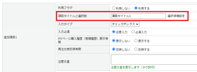 | 再注文時反映有無 | MYページ購入履歴詳細画面からの再注文時に、追加項目の内容での反映有無を設定します。 デフォルトは[反映しない]です。 ※詳細は<こちら> |