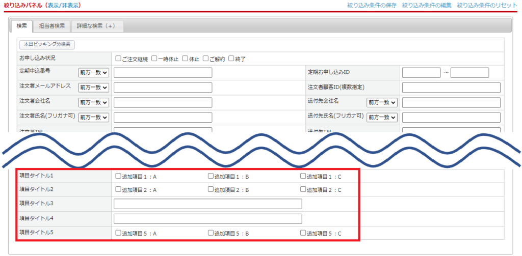 定期購入お申し込み一覧の絞り込みパネルの[検索]タブにて各追加項目での検索が可能です。