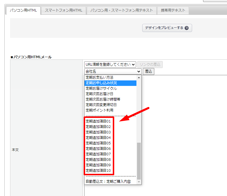 以下のメールカテゴリにおいて、「定期追加項目01~10」のタグを利用可能です。
