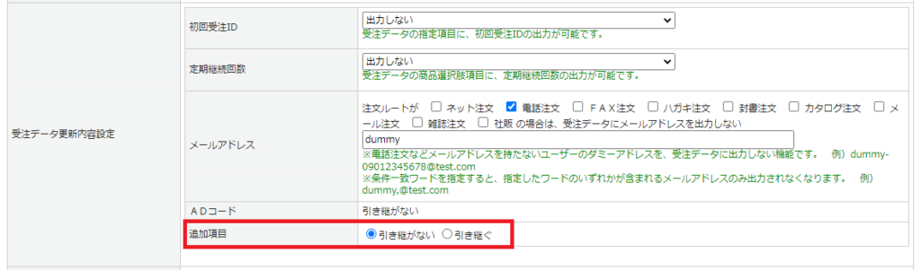 基本設定>カートシステム設定>[定期購入設定]タブ の受注データ更新内容設定にて、定期継続時に作成される受注に追加項目の設定内容の引き継ぐかを設定します。