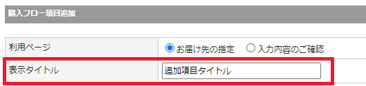 | 利用ページ | 追加項目を入力するページを設定します。 デフォルトは [入力内容のご確認] です。 ※詳細は<こちら>