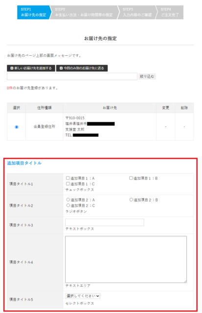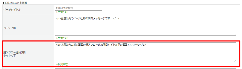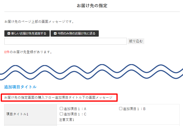 画面メッセージ設定>[買い物カゴ・購入フローページ]タブのお届け先の指定画面の「購入フロー追加項目タイトル下」