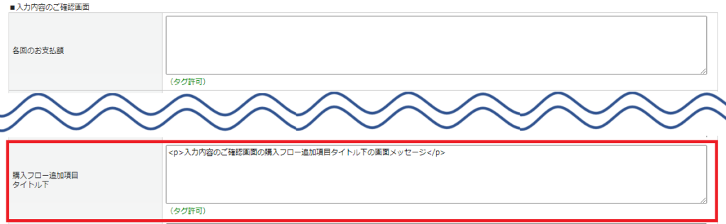 画面メッセージ設定>[買い物カゴ・購入フローページ]タブの入力内容のご確認画面の「購入フロー追加項目タイトル下」