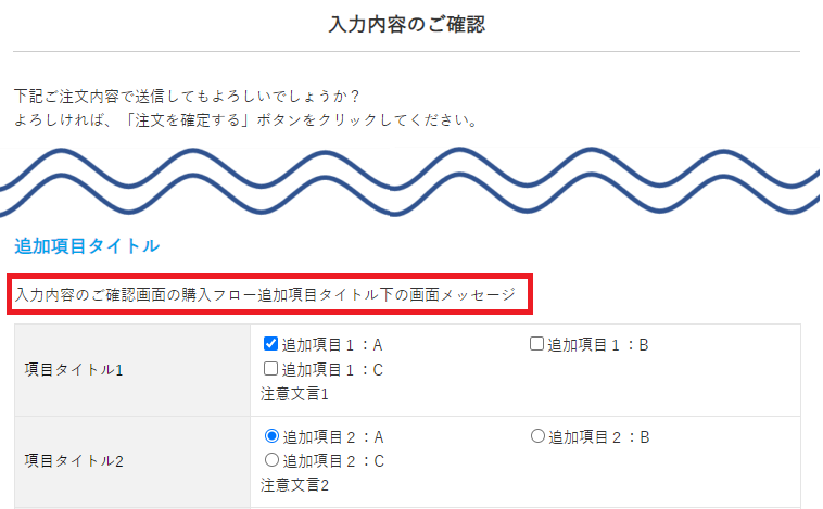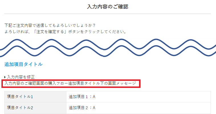 入力内容のご確認画面の購入フロー追加項目タイトル下の画面メッセージを設定します。
