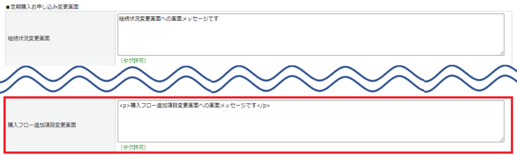 画面メッセージ設定>[MYページ]タブの定期購入お申し込み変更画面の「購入フロー追加項目変更画面」