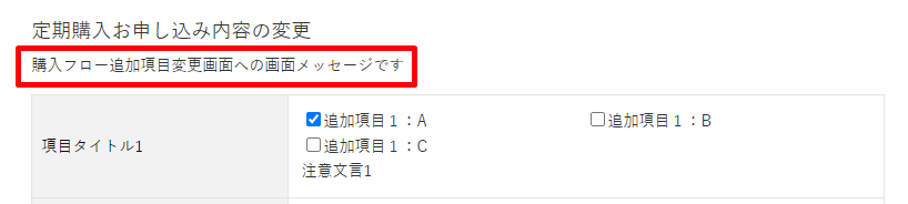 MYページ定期購入お申し込み詳細画面で購入フロー追加項目を変更する購入フロー追加項目変更画面の画面メッセージを設定します。