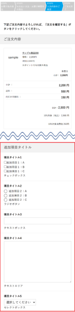 購入フロー追加項目の入力可能な下記の画面で表示されます。