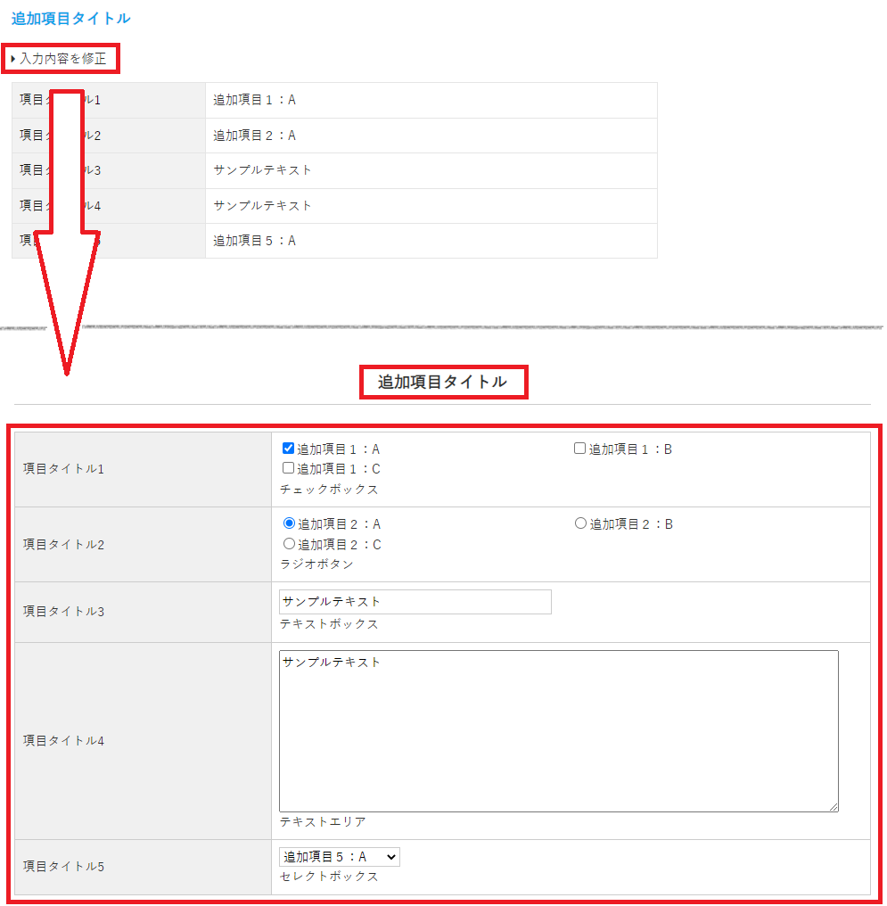 入力内容修正画面のタイトル名は「表示タイトル」に設定した内容が表示されます。