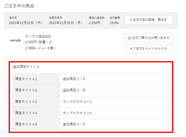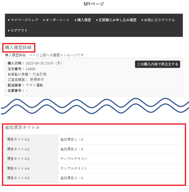 <カートシステム設定>で追加項目の「MYページ購入履歴表示有無」を[表示する]に設定している場合、購入履歴詳細に追加項目が表示されます。