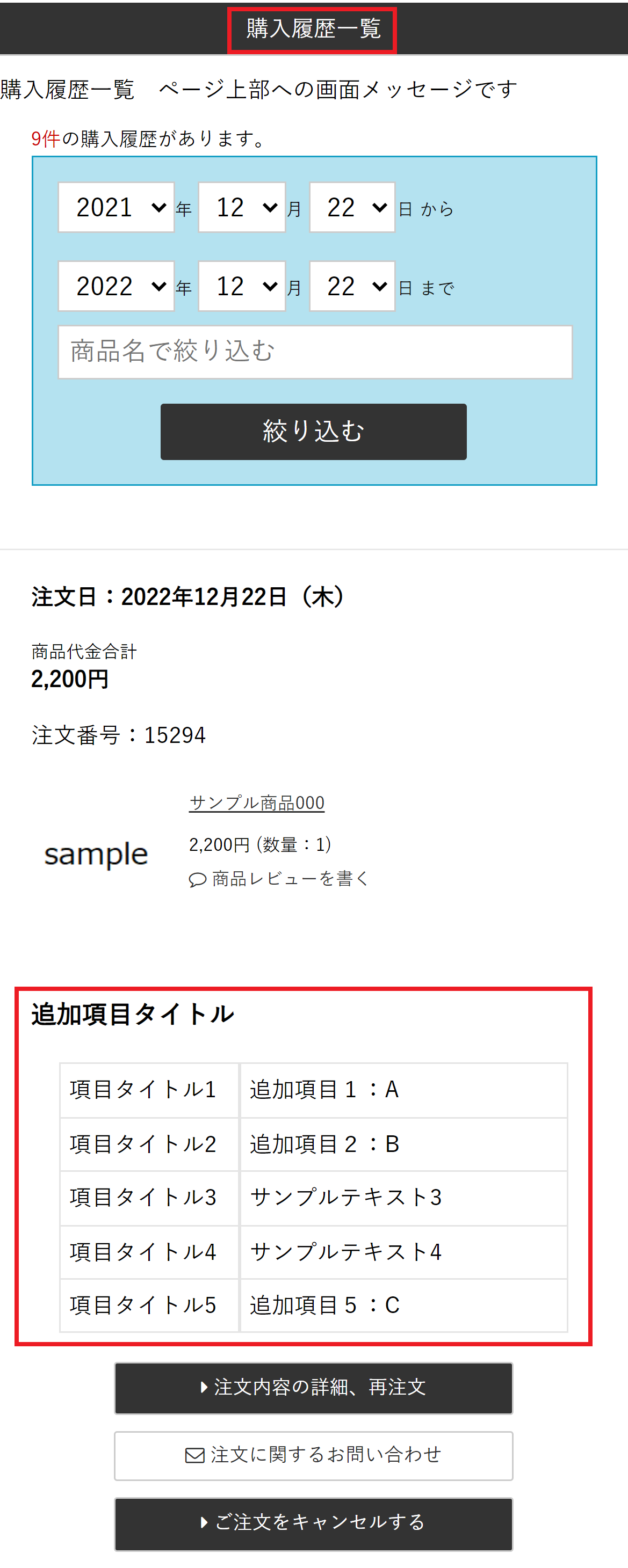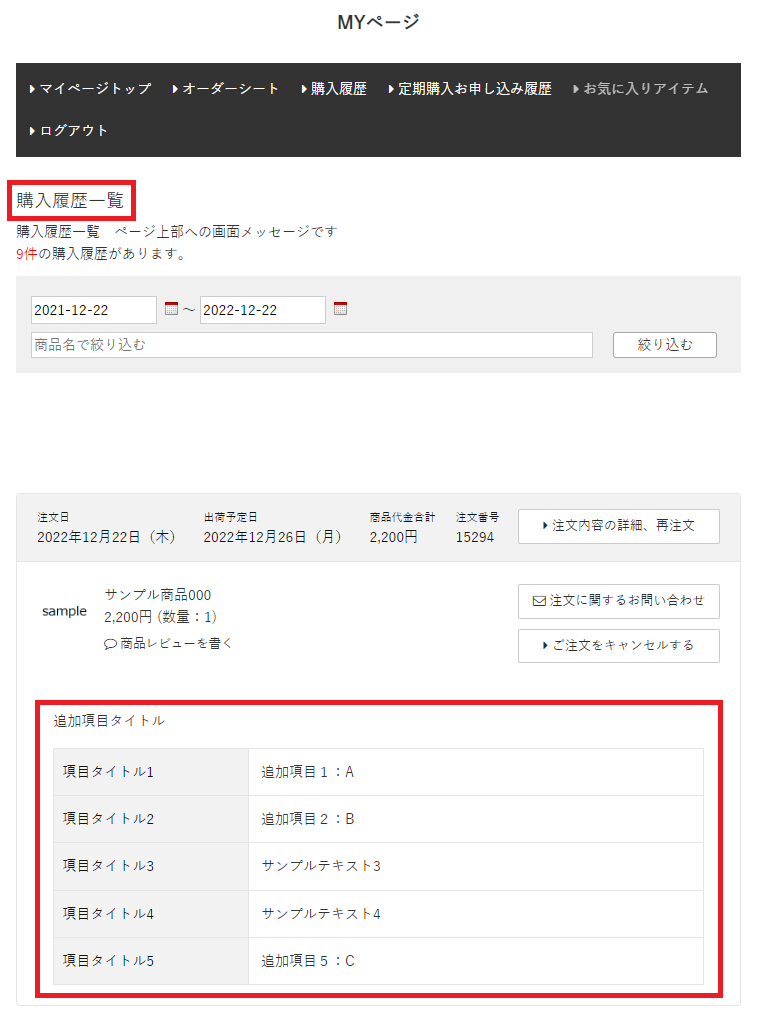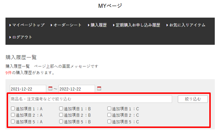 MYページ購入履歴一覧で購入フロー追加項目を検索対象とすることが可能です。