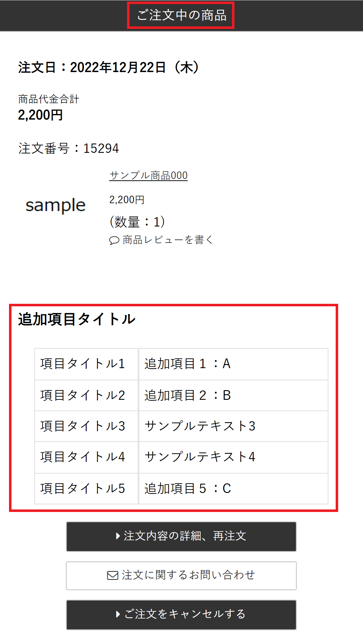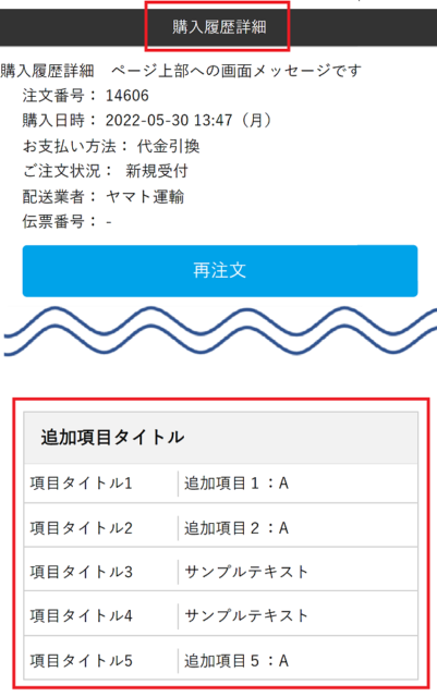 <カートシステム設定>で追加項目を「再注文時反映有無」を[反映する]に設定した場合、購入履歴詳細画面からの再注文時に前回注文時の追加項目内容が自動入力されて表示されます。