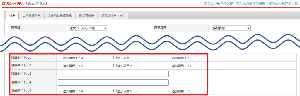 受注一覧の絞り込みパネルの[検索]タブにて各追加項目での検索が可能です。