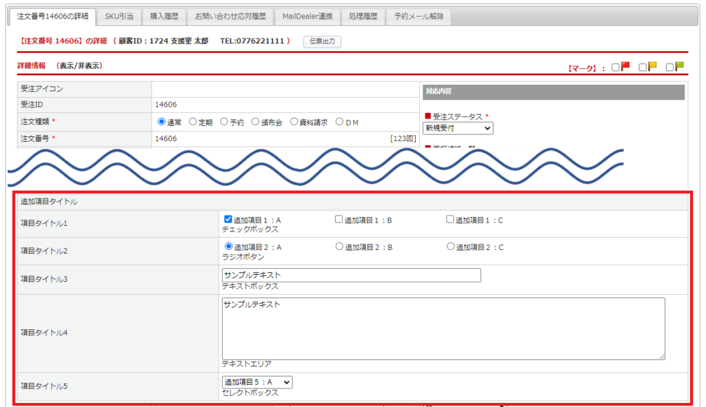 追加項目を設定した際、受注登録画面において商品情報の下に追加項目の入力枠が表示されます。