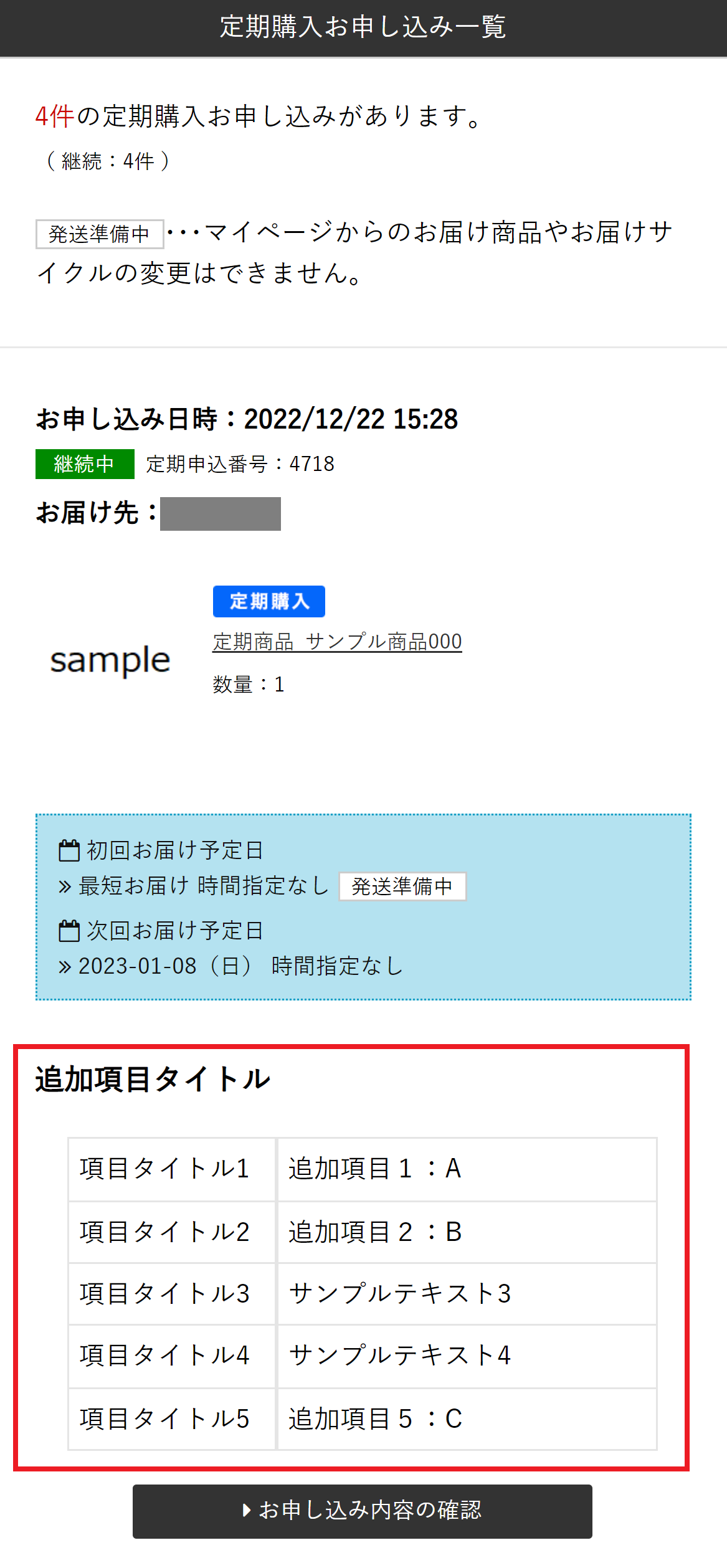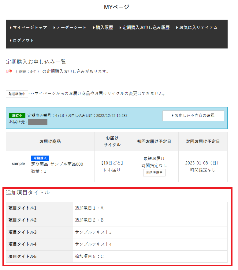 <カートシステム設定>で追加項目の「MYページ定期購入お申し込み詳細表示有無」を[変更可]または[変更不可]に設定している場合、定期購入お申し込み詳細に追加項目が表示されます。
