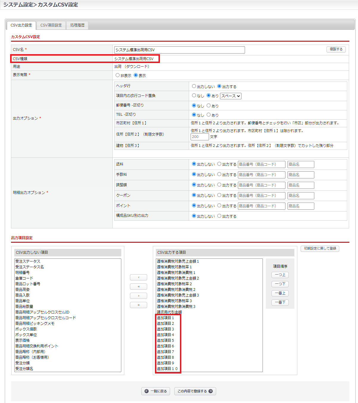 システム標準出荷用CSVをダウンロードする際にも、「追加項目1~10」が追加されます。