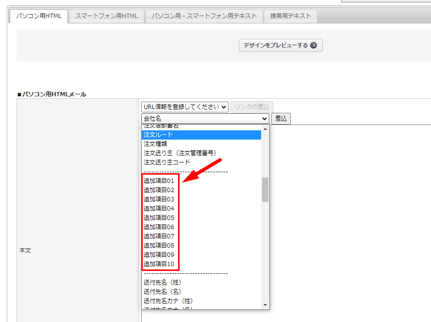 以下のメールカテゴリにおいて、「追加項目01~10」のタグを利用可能です。