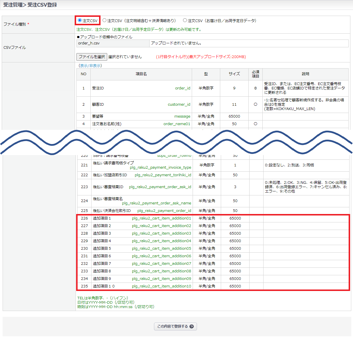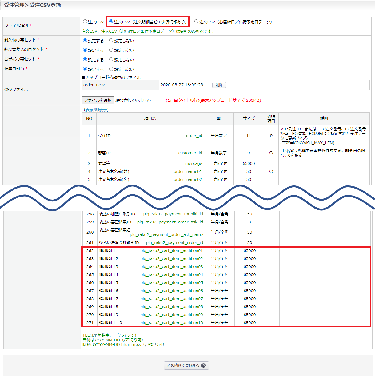 CSV項目「追加項目1~10」を含むCSVのアップロード時、<カートシステム設定>の「利用フラグ」が[利用しない]に設定されている追加項目に値を入力している場合でも登録は可能です。
