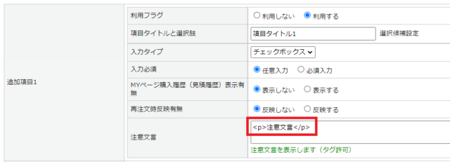 | 再注文時反映有無 | MYページ購入履歴詳細画面からの再注文時に、追加項目の内容での反映有無を設定します。 デフォルトは[反映しない]です。 ※詳細は<こちら> |