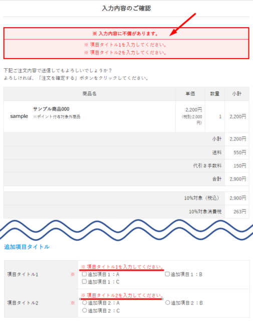 画面メッセージ設定>[買い物カゴ・購入フローページ]タブの入力内容誤ご確認画面の「購入フロー追加項目タイトル下」