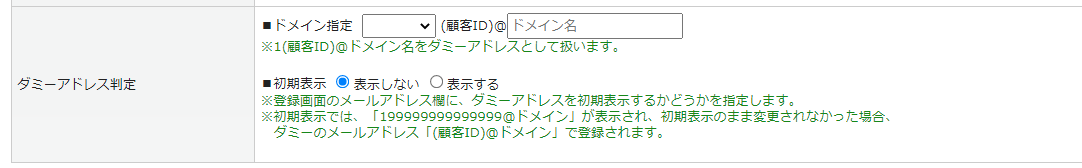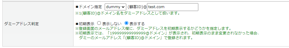 ドメイン指定を「dummy(顧客ID)@test.com」、初期表示を「表示する」に設定した場合