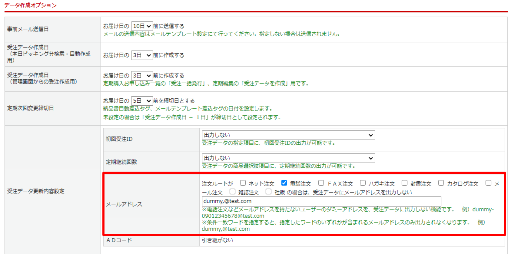 ダミーのアドレスを登録される際には、受注発行時にメールアドレスが出力されないように、以下の設定をお願いいたします。