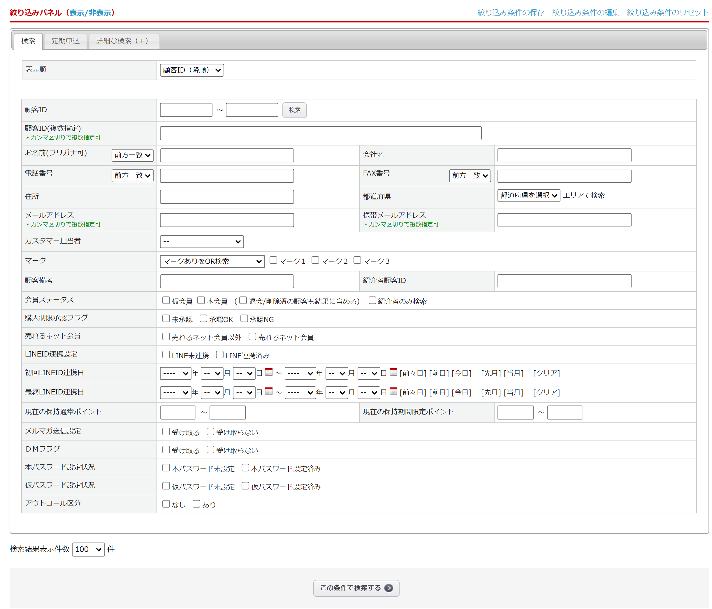 登録済みの顧客データを絞り込み条件で検索し、一覧で確認できます。