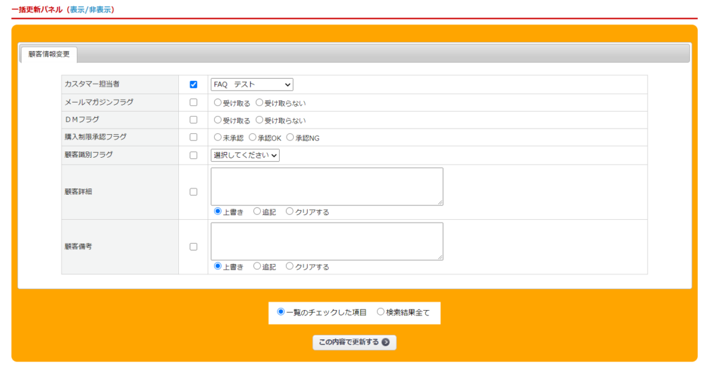 更新する項目にチェックを入れ、更新内容を設定した後、【この内容で更新する】ボタンをクリックすると顧客データに更新内容が反映されます。