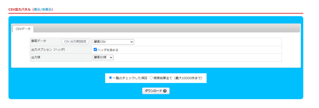 顧客データ欄【CSV出力項目設定】ボタンをクリックすると出力するCSVの詳細な設定が可能です。