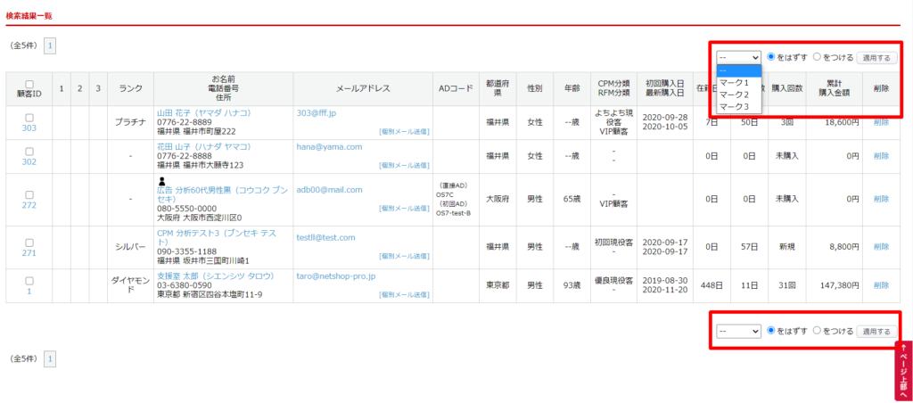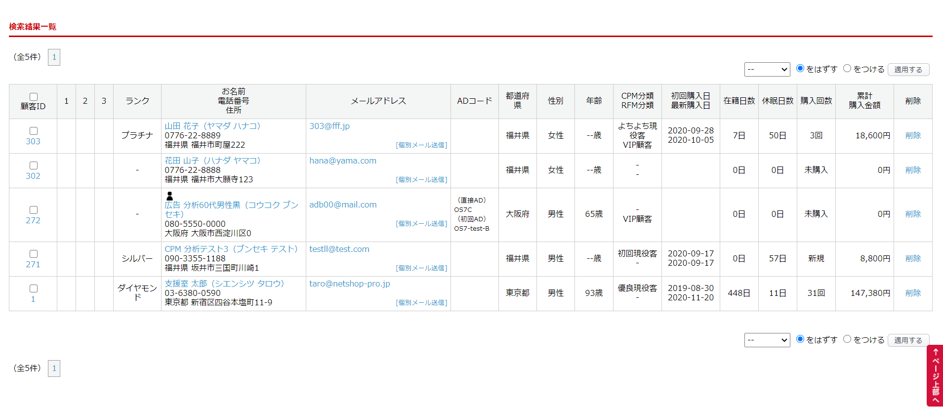 また、顧客データの一括更新、CSV出力、個別メール送信が可能です。