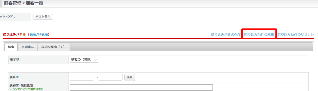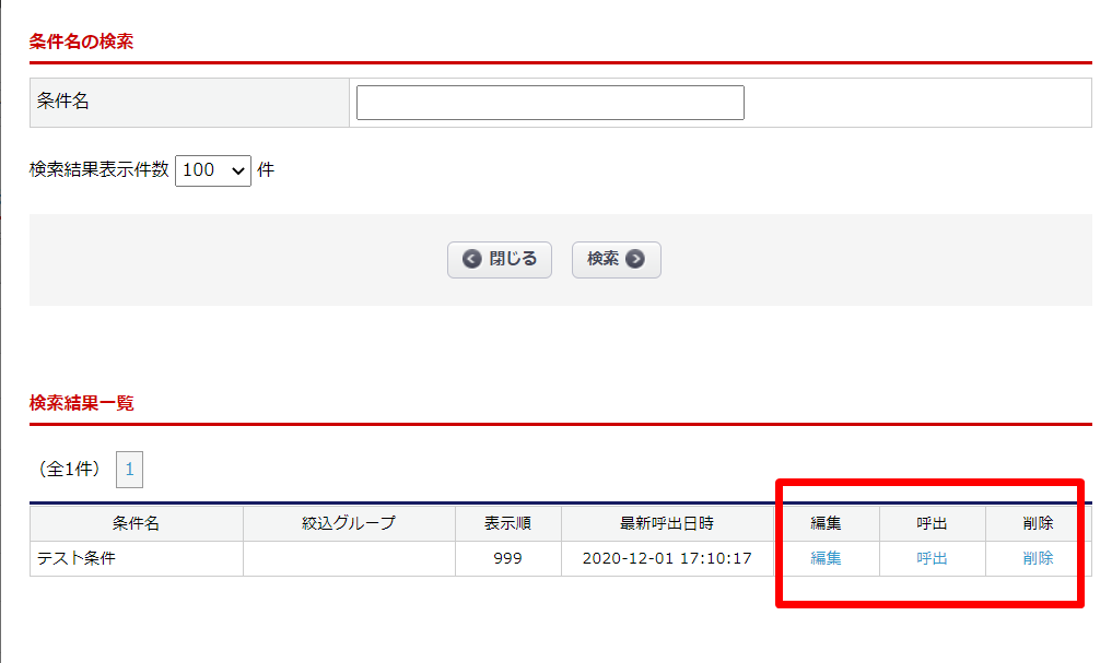 「絞り込み条件の編集」をクリックすることで、作成したショートカットボタンの編集・呼出・削除ができます。