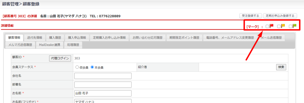 「顧客>顧客登録」画面右上にて顧客別に内部管理用のマークを任意で設定できます。※複数設定可