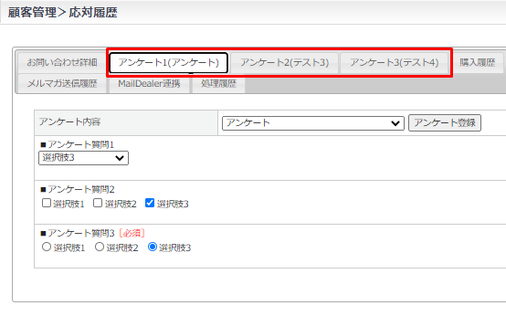 タブの名称「アンケート1()」のカッコ内にはセットされている「アンケート内容」が表示されます。
