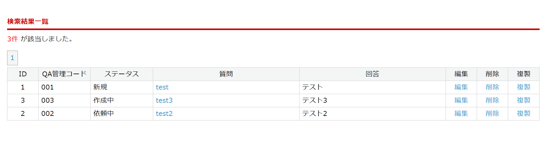 | QA管理コード | QA管理コードを条件に部分一致で検索します。 |