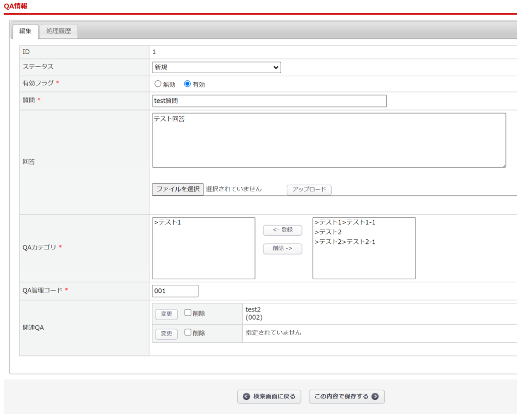 | 有効フラグ * | QA情報の[有効/無効]を登録してください。 |