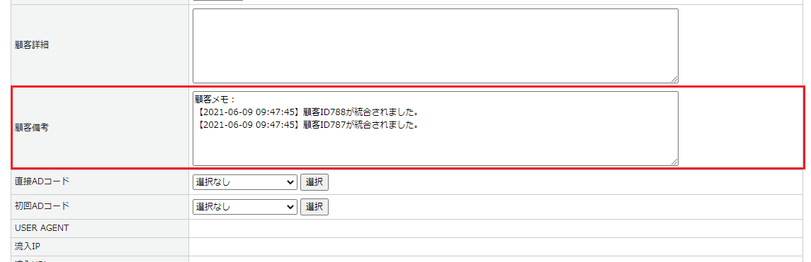 顧客統合後、顧客備考に履歴を残すことができます。