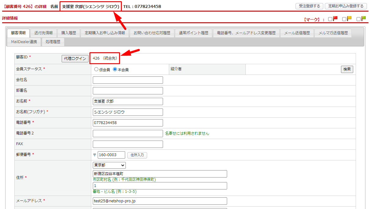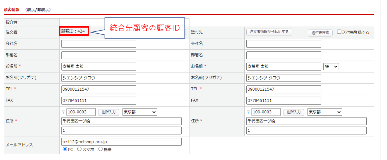 顧客統合後、統合元顧客の顧客データは削除され、顧客統合パネルで指定した顧客IDの下に【統合先】と表示されます。