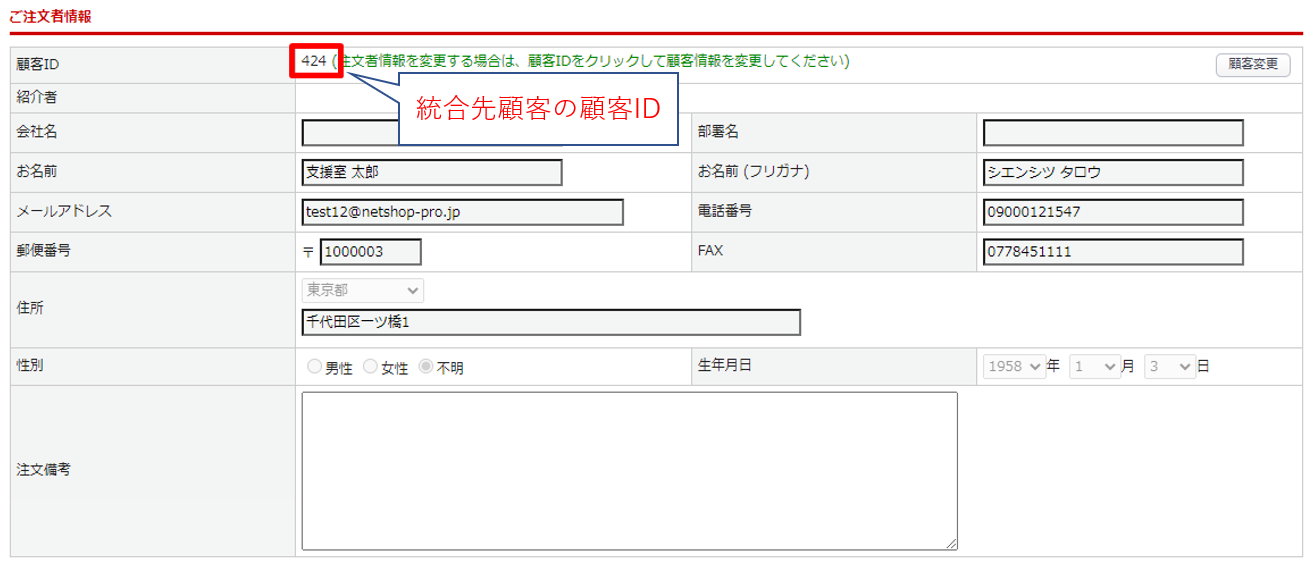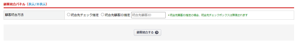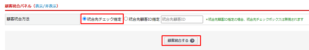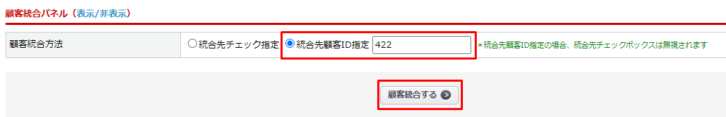 顧客統合パネルの「統合先顧客ID指定」を選択し、統合先顧客IDを入力します。