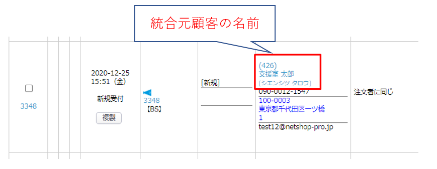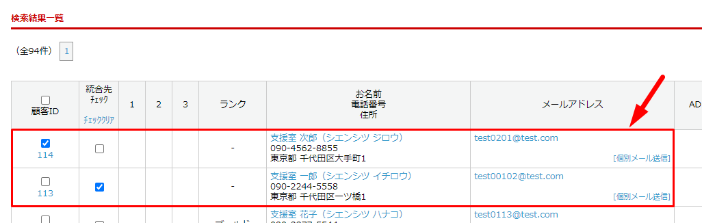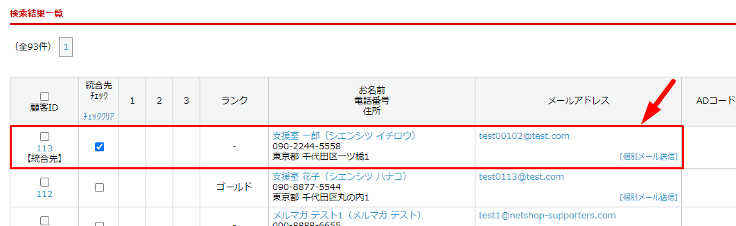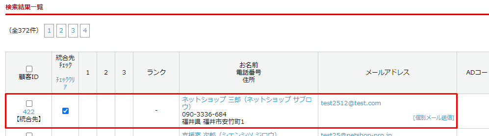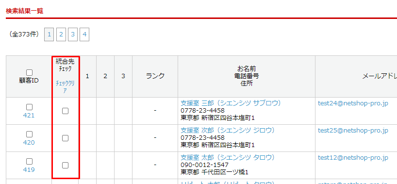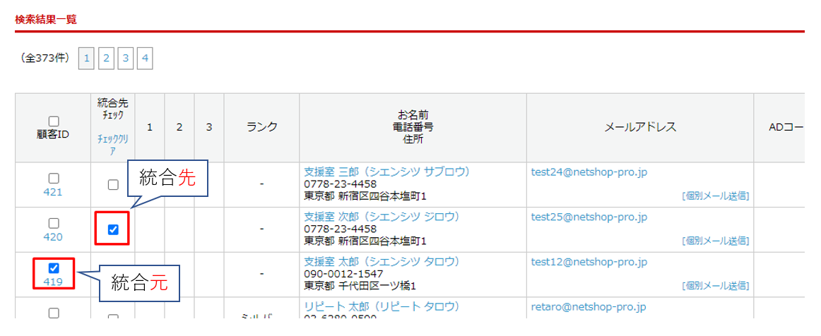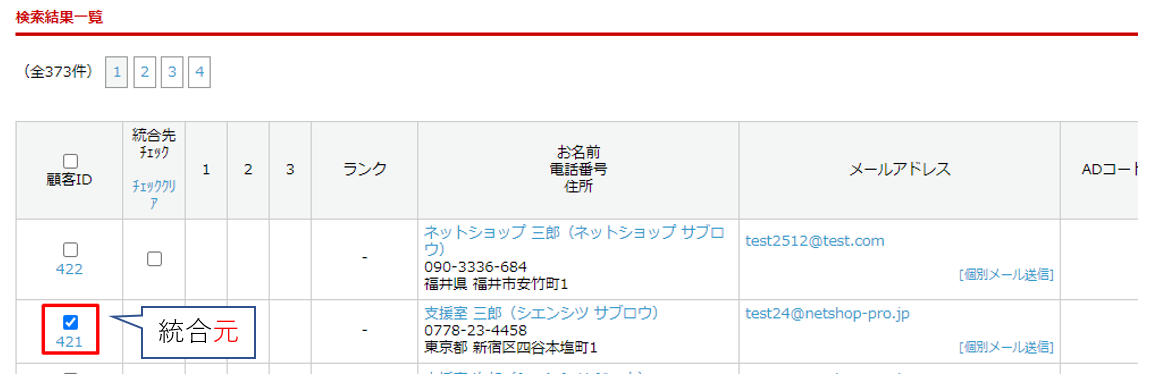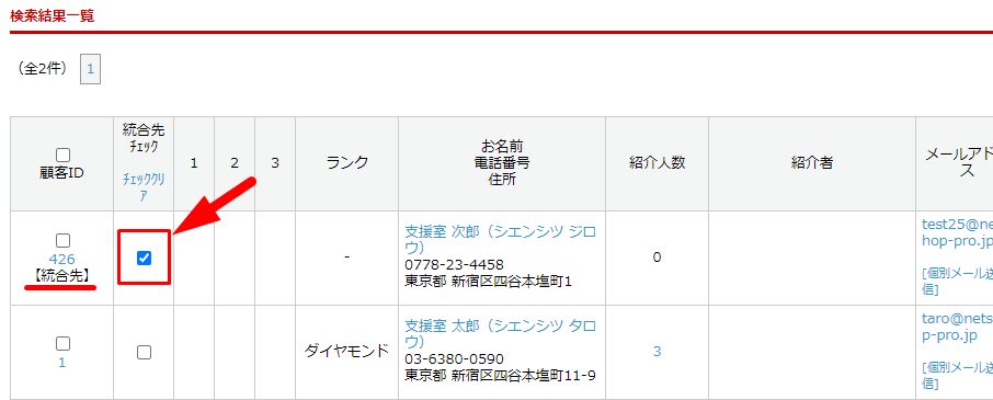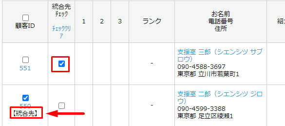 顧客IDが統合元、統合先チェックが統合先となります。
