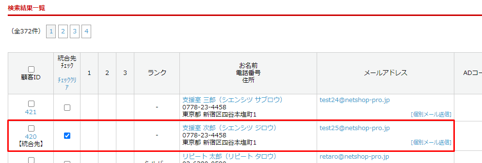 統合先になっている顧客にデフォルトで「統合先チェック」項目にチェックが入ります。