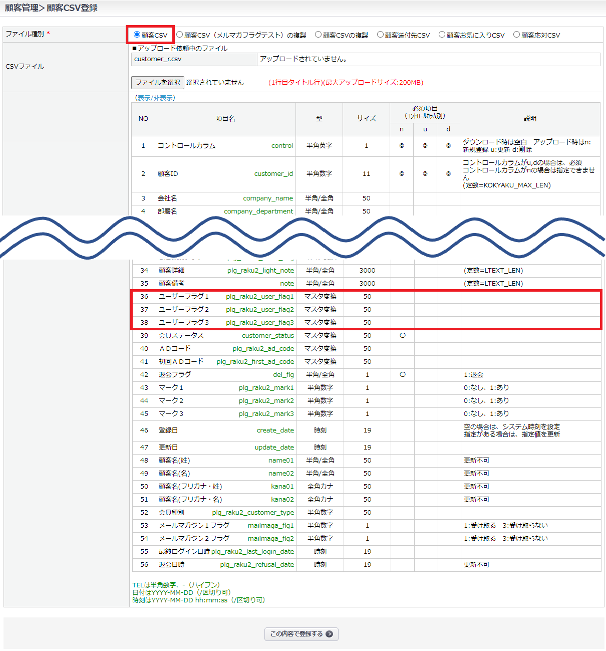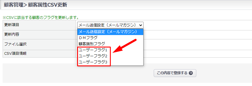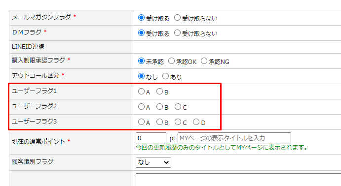 ※「顧客管理:ユーザーフラグ名称」の登録に制限はないが、選択肢登録が可能な追加項目は3つになります。