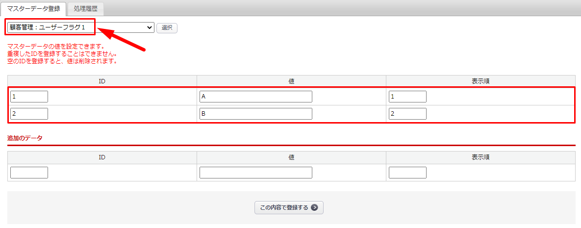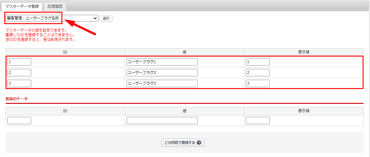 ユーザーフラグ2を利用したい場合は「 ID:2 」で表示させたい名称を値に入力してください。