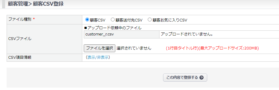 顧客>顧客CSV登録 の詳細についてはこちらをご参照ください。