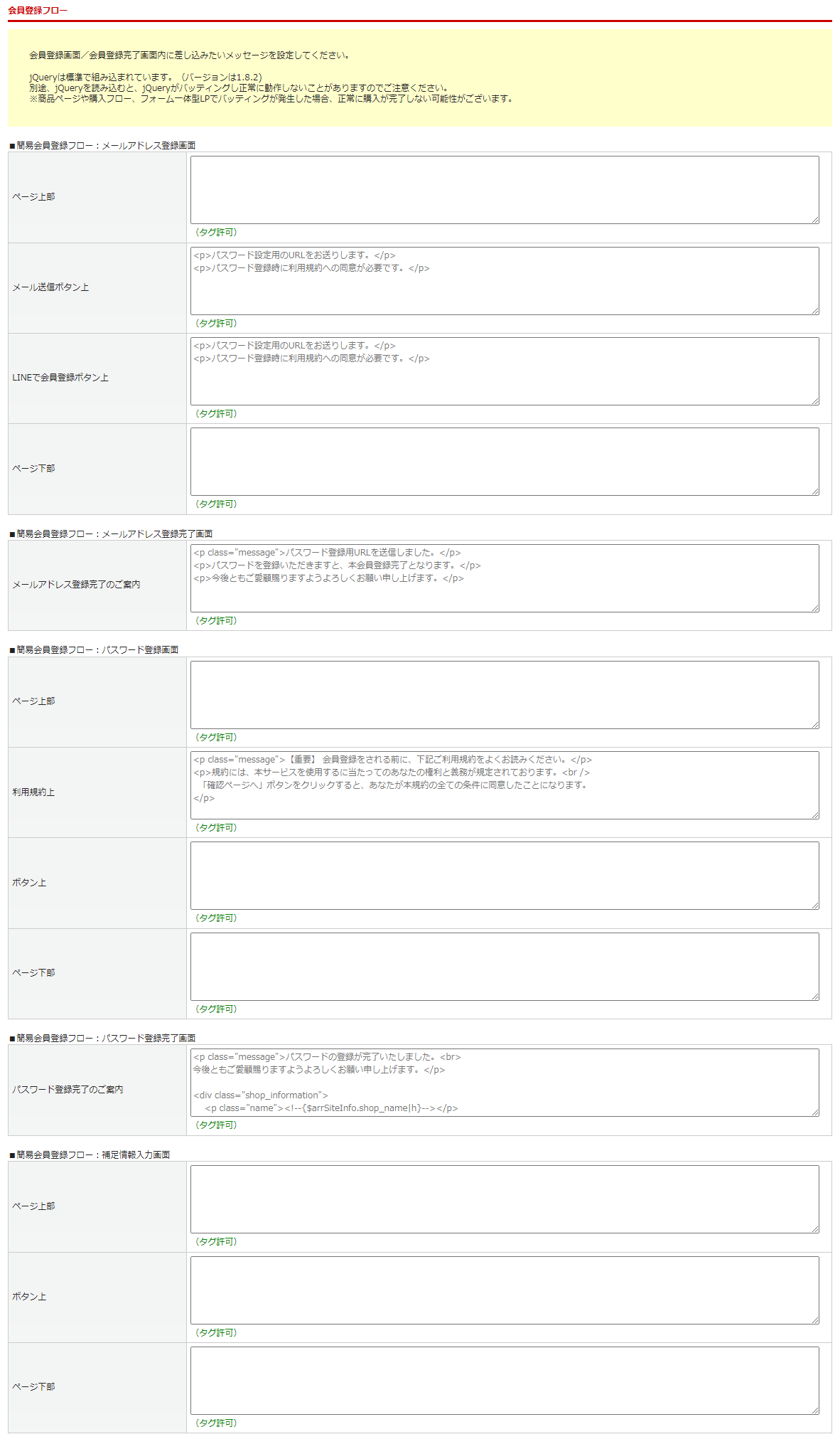 <デザイン(PC/スマートフォン)>画面メッセージ設定>会員登録・変更ページ>から、簡易会員登録フローの画面メッセージが変更できます。