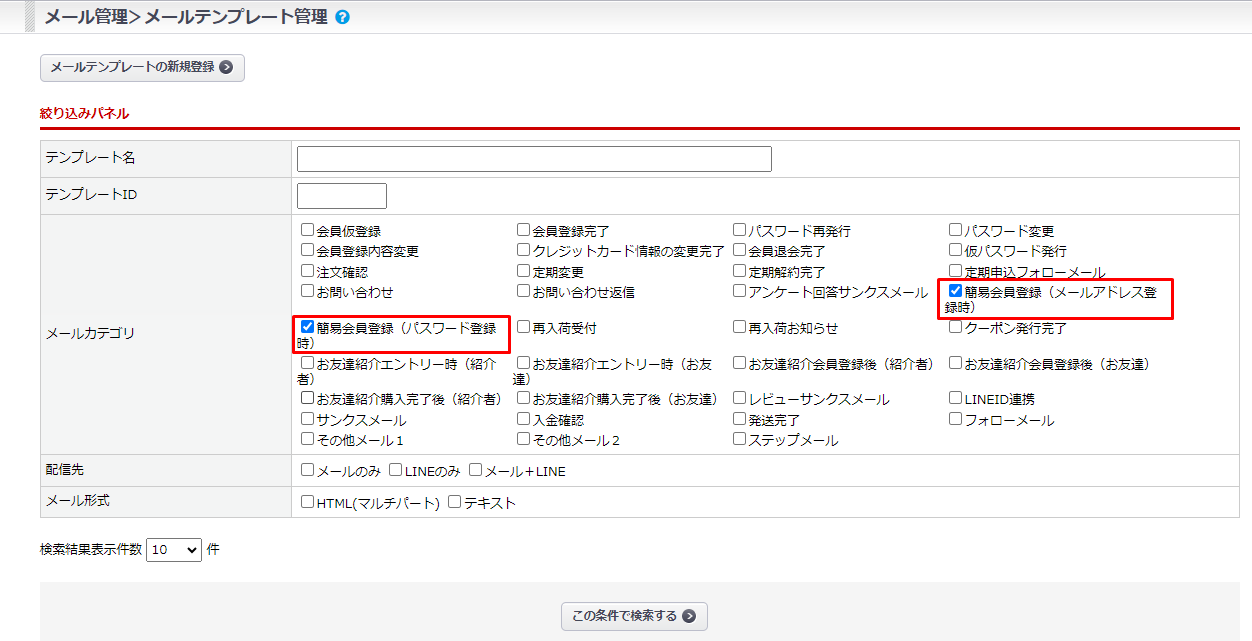 テンプレートの登録がない場合は、メールカテゴリ「簡易会員登録」でメールアドレス登録時・パスワード登録時のメールをそれぞれ作成してください。