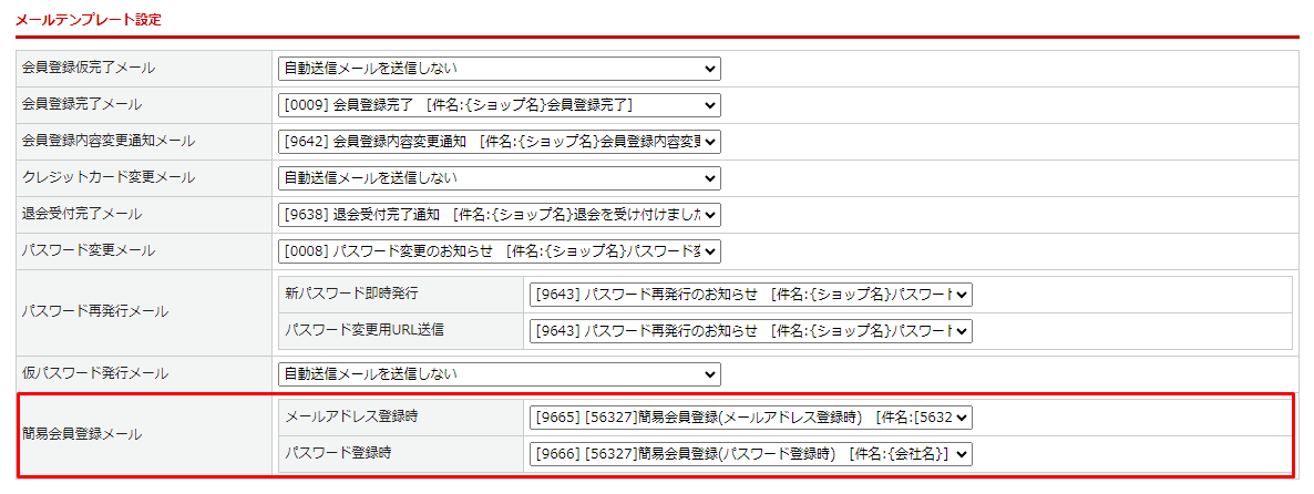 <基本設定>カートシステム設定>[メールテンプレート設定]>タブの項目「簡易会員登録メール」から、メールテンプレート管理で設定したテンプレートを登録できます。