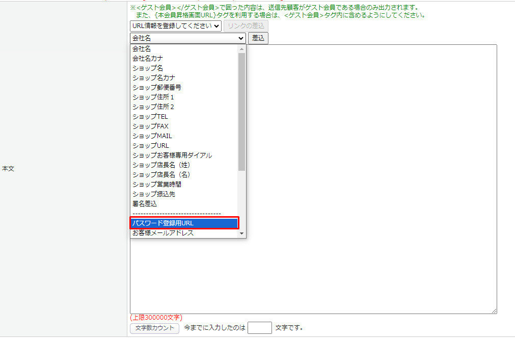 メールアドレス登録時のテンプレートには、必ず{パスワード登録用URL}のタグをご利用ください。 - 基本設定>カートシステム設定>[カート・決済機能設定]タブの項目「パスワード再発行方式」をパスワード変更用URL送信に変更