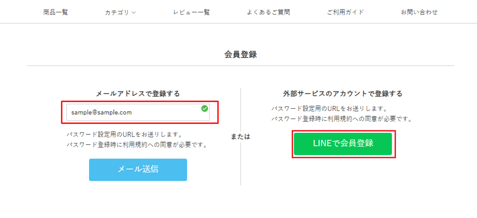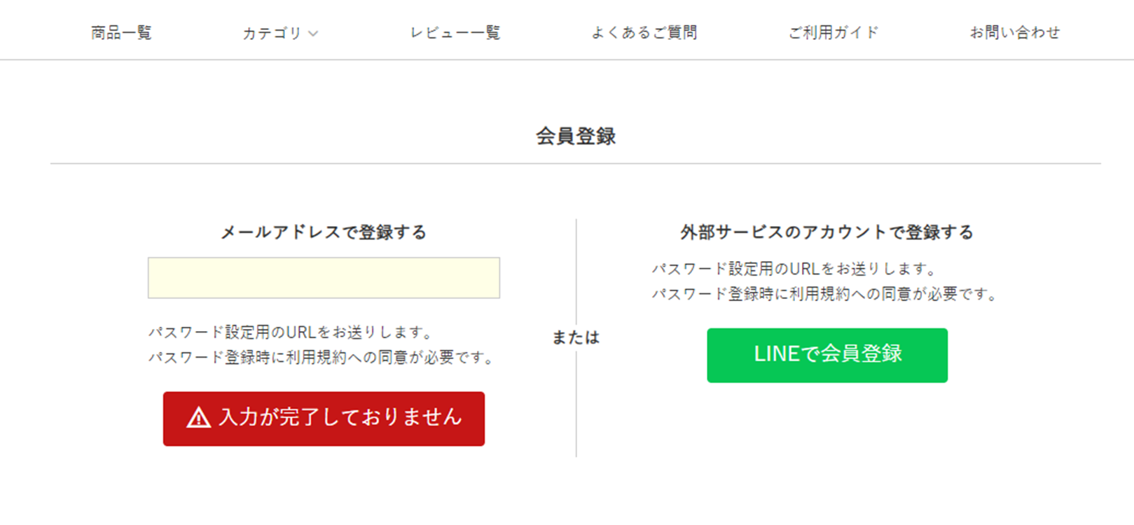 簡易会員登録画面でメールアドレスを入力し送信するか、LINEで会員登録を実施すると、そのメールアドレスで簡易会員が作成されます。(パスワード未登録状態)